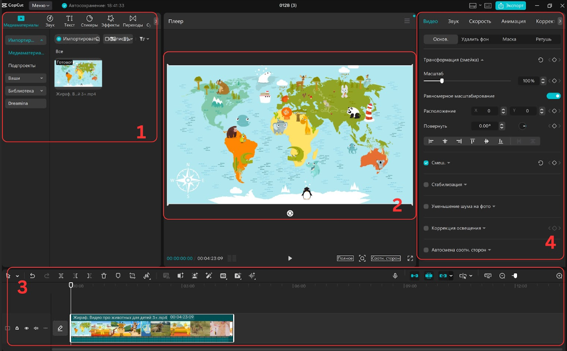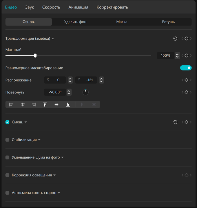 Меню панели свойств (справа) меняется в зависимости от того, что вы выделили на таймлайне. Здесь находятся настройки видео, звука, скорости, анимации и цветокоррекция.