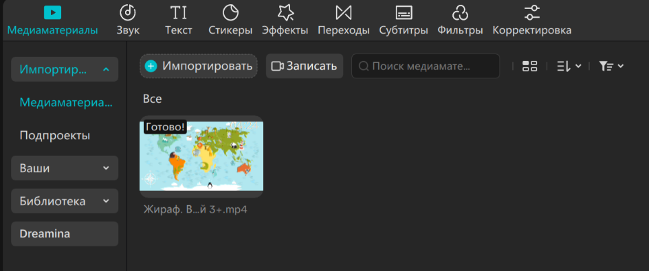 В верхней строке находятся вкладки «Звук», «Текст», «Стикеры», «Эффекты», «Переходы», «Субтитры», «Фильтры», «Корректировка». Все, что нужно добавить поверх видео, берется здесь.
