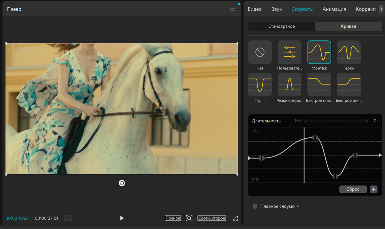 Отдельного внимания заслуживает работа со скоростью. Инструмент «Кривая» позволяет создавать плавные замедления и ускорения, добавляя ролику динамики.
