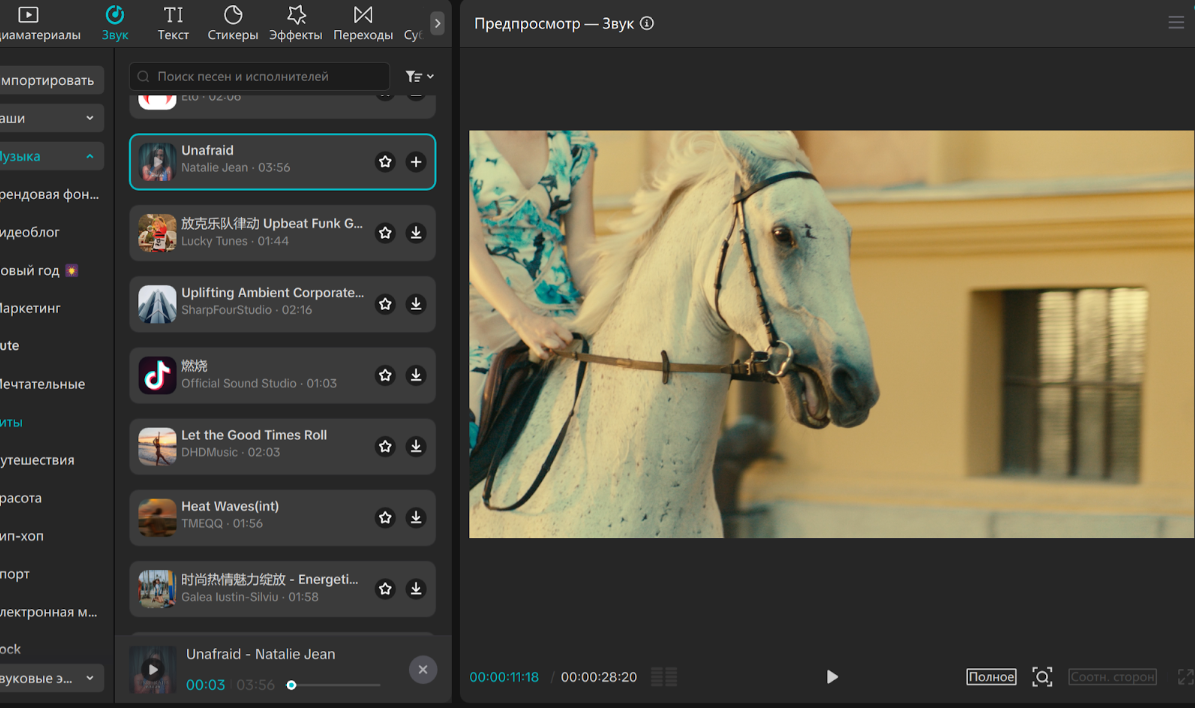 В редакторе можно добавлять музыку, звуковые эффекты и записывать голос поверх видео. Доступна базовая настройка громкости, обрезка аудио и синхронизация со сценами. Также работает функция извлечения звука из видео. Для более чистого звучания предусмотрена опция «Уменьшение шума», которая убирает эхо и посторонние звуки.