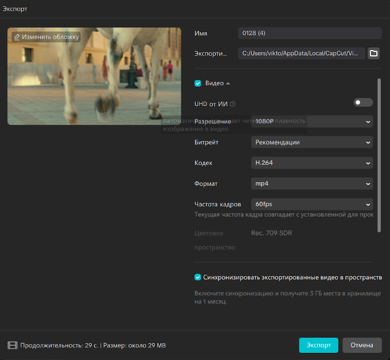 Шаг 7. Когда монтаж готов, нажмите синюю кнопку «Экспорт» в правом верхнем углу. Для Instagram Reels и TikTok выбирайте разрешение 1080p и частоту кадров 60 fps.