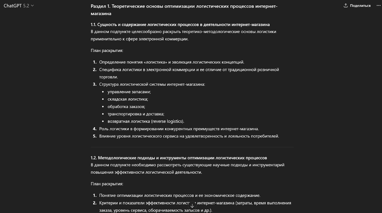Начинаем всегда со структуры. Достаточно загрузить тему и попросить разбить текст на главы и подпункты. Этот черновик стоит сразу показать научному руководителю. Утвержденный план станет каркасом, за рамки которого алгоритм уже не выйдет.