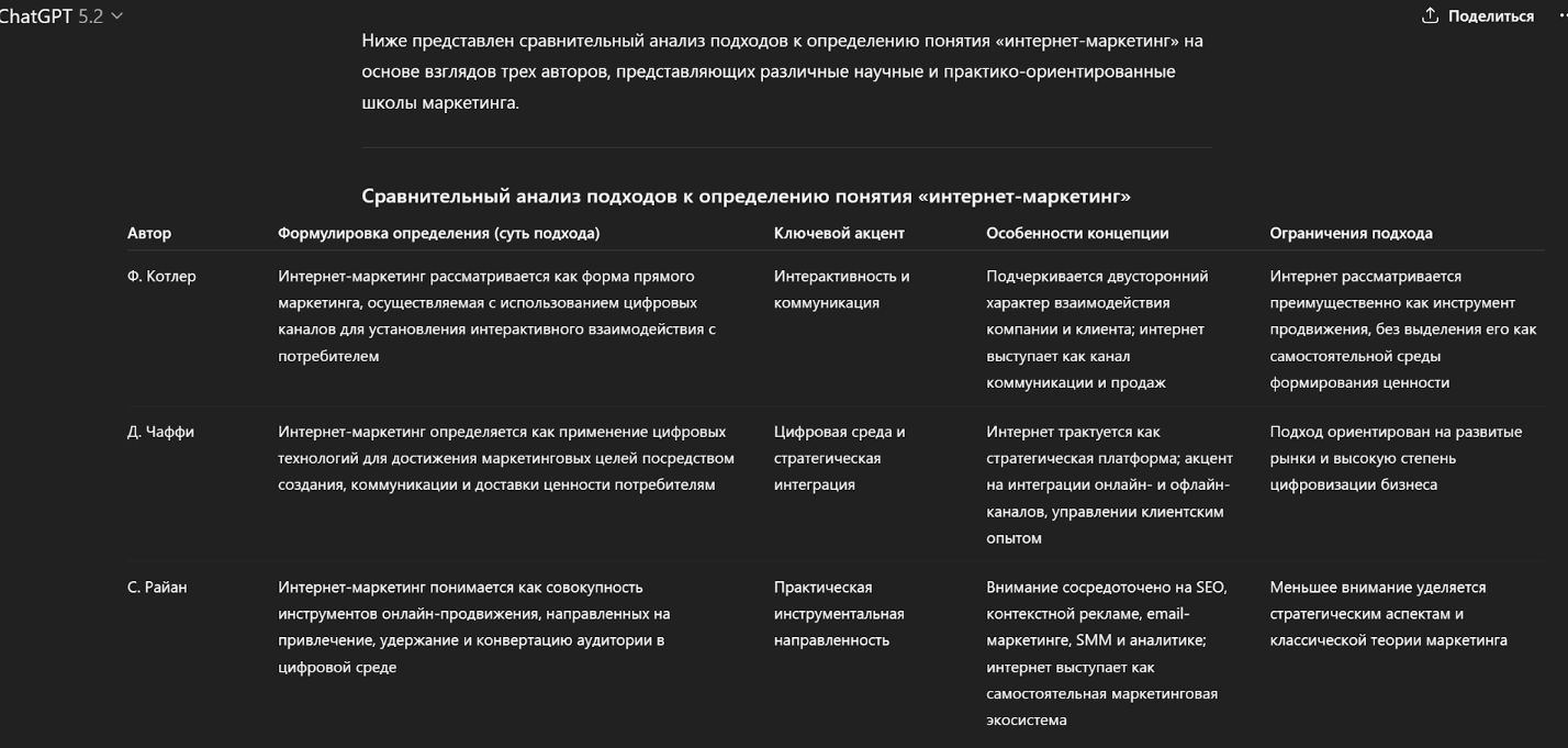 «Сделай сравнительный анализ подходов к определению "интернет-маркетинг". Опиши взгляды трех разных авторов. Оформи результат в виде таблицы».