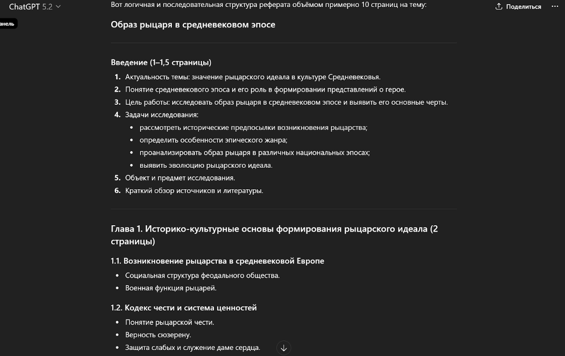 Бесплатная модель ChatGPT – это отличный генератор идей. Набросать черновик, найти определение или составить структуру она точно сможет. Но если вы попросите ее написать готовый раздел реферата, результат вас разочарует.