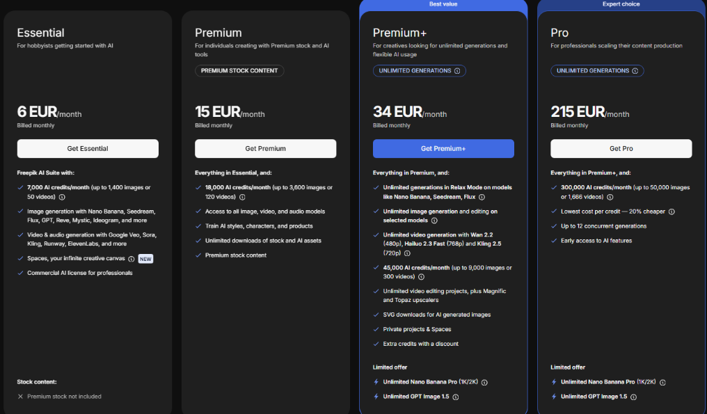 Если у вас бесплатный план, вы получаете 10 скачиваний в день для стокового контента. Тарифы Premium, Premium+ или Pro снимают лимиты и открывают неограниченные загрузки. План Essential рассчитан на юзеров, которых интересует ИИ-контент. В нем можно скачать до 10 стоковых изображений в день, а также использовать больше 16 тисяч кредитов для ИИ-контента.