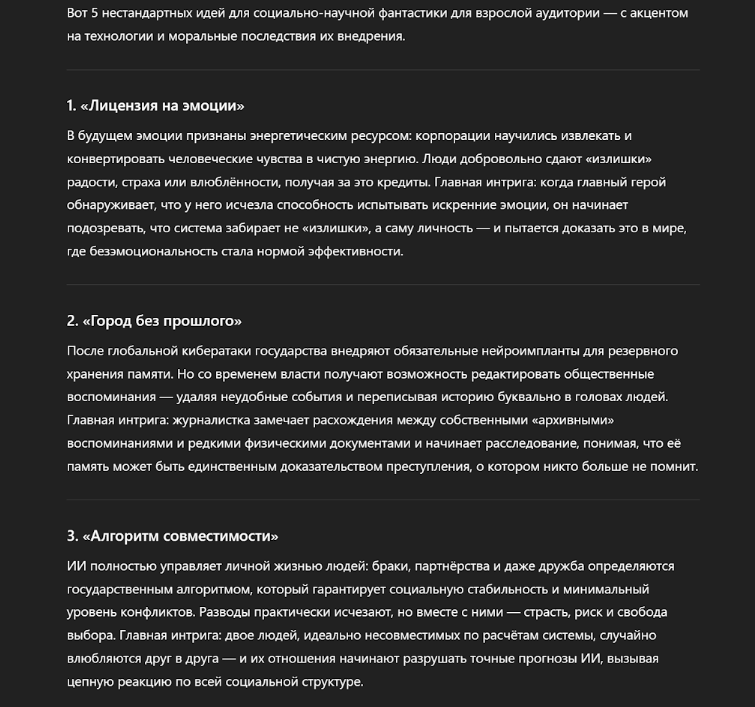 «Выступай как опытный редактор книжного издательства. Предложи 5 нестандартных идей для sci-fi романа. Целевая аудитория – взрослые. Фокус на социальной фантастике и технологиях будущего. Опиши главную интригу для каждого варианта в 2-3 предложениях».