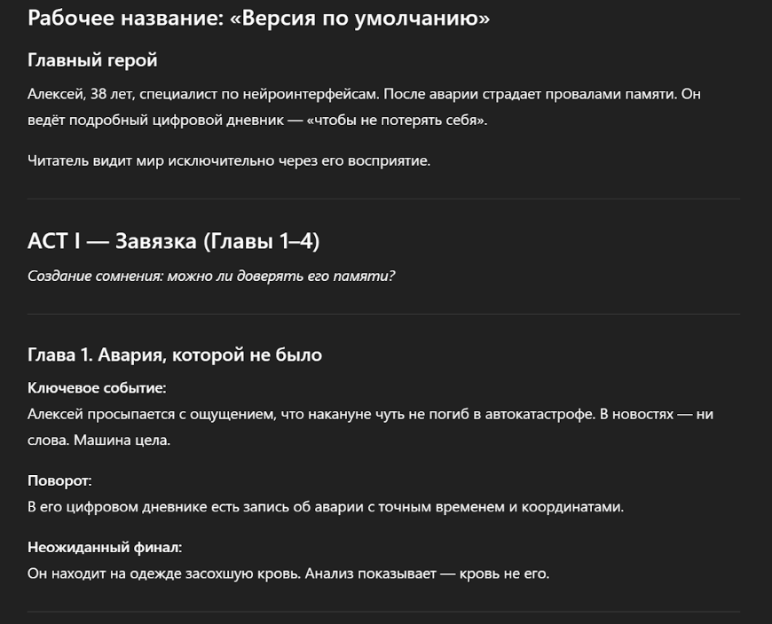 Идея есть, но нам также нужен скелет. Запросите поглавный план, котором ИИ выстроит логику, распределит напряжение и расставит неожиданные повороты.