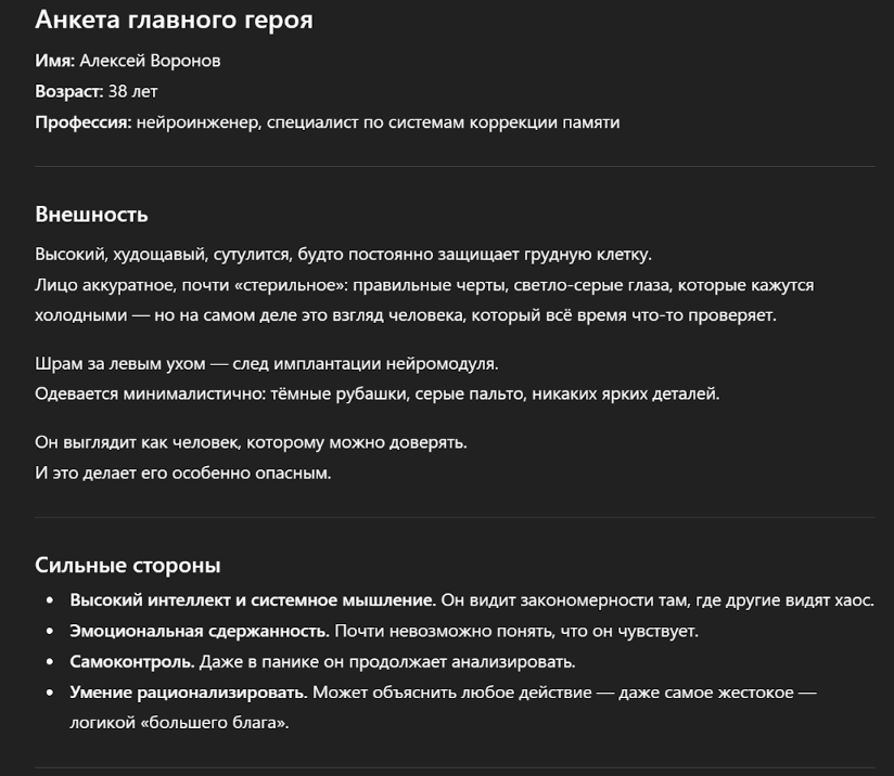 «Создай анкету главного героя для романа]. Опиши его внешность, сильные стороны и главный внутренний недостаток. Укажи его истинную цель и ложное убеждение. Оно должно мешать ему достичь цели. Добавь травму из прошлого. Она должна определять его поступки сегодня».