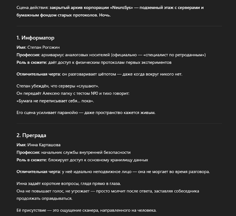 Картонные герои убивают весь интерес. Читатель должен верить персонажам. Им нужны конфликты, слабости и скрытая мотивация. Попросите ChatGPT собрать подробные досье на каждого участника истории.