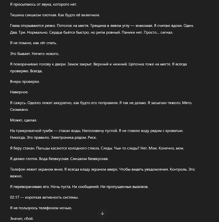 «Напиши первую сцену первой главы (около 500 слов). Главный герой просыпается в своей запертой квартире, но замечает мелкие детали, которых вчера не было. Фокус на нарастающей паранойе и путаном внутреннем монологе. Читатель должен сразу почувствовать, что рассказчику нельзя доверять. Стиль: мрачный, напряженный, короткие рубленые фразы. Избегай долгих описаний интерьера. Задай высокий темп с первой строчки».