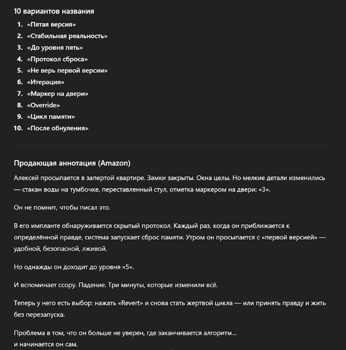 «Придумай 10 интригующих вариантов названия для этой книги. Затем напиши продающую аннотацию (до 1000 символов) для публикации на Amazon. Текст должен создавать интригу, обрываться на самом интересном месте и мотивировать читателя купить книгу».