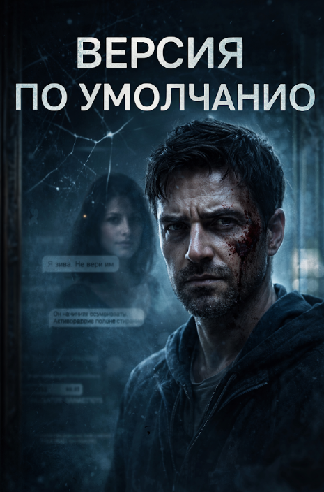 «Cinematic book cover for a psychological thriller titled “Версия по умолчанию”. Hyperrealistic style, cold blue color grading, minimalistic composition. A 38-year-old man stands in front of a cracked mirror, half-lit by cold window light. His face is tense, subtle dried blood on his temple, not exaggerated. In the mirror behind him – a faint, blurred reflection of a woman, slightly out of focus, almost ghostlike. Subtle digital UI elements faintly reflected in the glass (minimal, not distracting), hinting at memory manipulation. Moody atmosphere, soft volumetric fog, shallow depth of field. Dark negative space in the upper third of the image for large title placement. No text rendered in image. Clean, high-end thriller aesthetic, realistic skin texture, cinematic lighting, dramatic contrast».