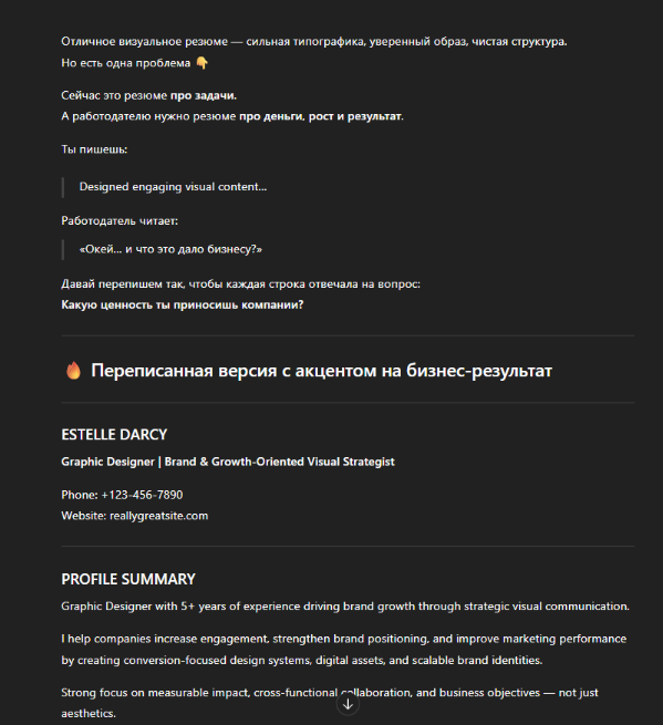 «Проанализируй мое резюме и перепиши его так, чтобы акцент был сделан на бизнес-результатах и ценности для работодателя. Замени описания обязанностей на формулировки, отражающие вклад и влияние на компанию».
