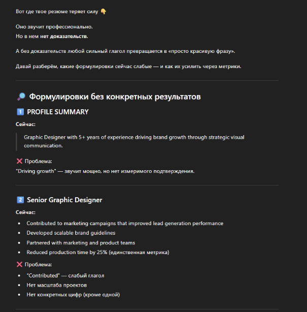 «Выступи в роли рекрутера. Укажи, какие блоки выглядят неубедительно, где не хватает конкретики и что может стать причиной отказа. Предложи конкретные правки».