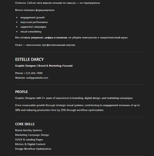 Не менее важно давать конкретику. Если нет цифр и результатов, ChatGPT не сможет сделать формулировки сильнее. В итоге резюме получается размытым. Добавьте к этому перегруженность: текст почти всегда нужно сокращать.