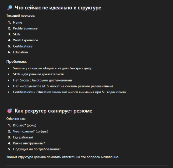 «Проанализируй структуру резюме. Предложи более логичную последовательность блоков и улучшенный формат подачи информации для быстрого сканирования рекрутером».