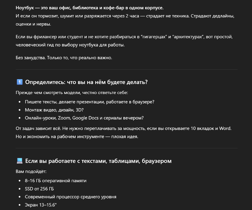 «Действуй как Senior Copywriter. Напиши статью про выбор ноутбука для работы. Аудитория: фрилансеры и студенты, не гики. Тон: дружелюбный, экспертный, без сложной терминологии».