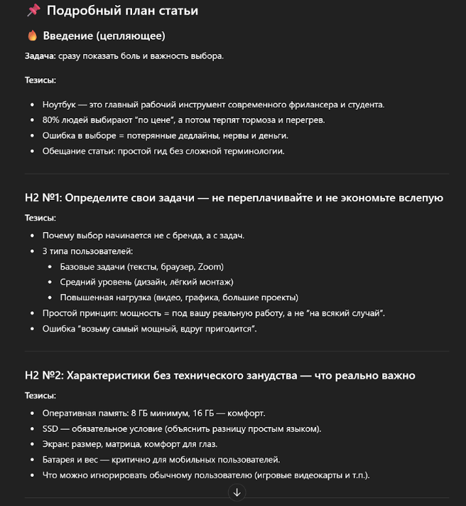 «Составь подробный план для этой статьи. Сделай цепляющее введение, 4 раздела H2 и мощный призыв к действию в конце. Кратко пропиши тезисы для каждого подзаголовка».