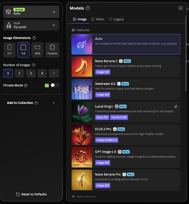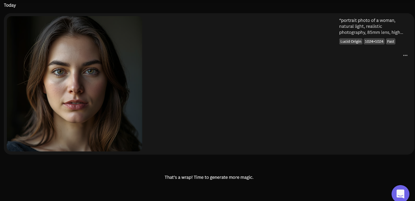 Прямо по центру находится строка «Type a prompt…» для промптов. Справа расположена кнопка «Generate». Под строкой есть быстрые кнопки, которые переключают режимы: создание картинки, видео, работа с холстом или рисование.