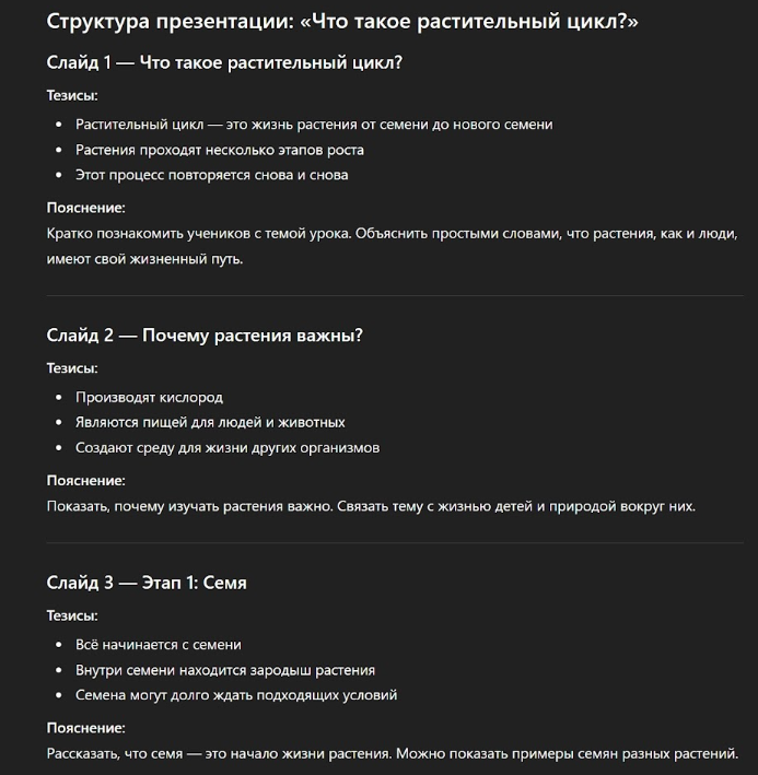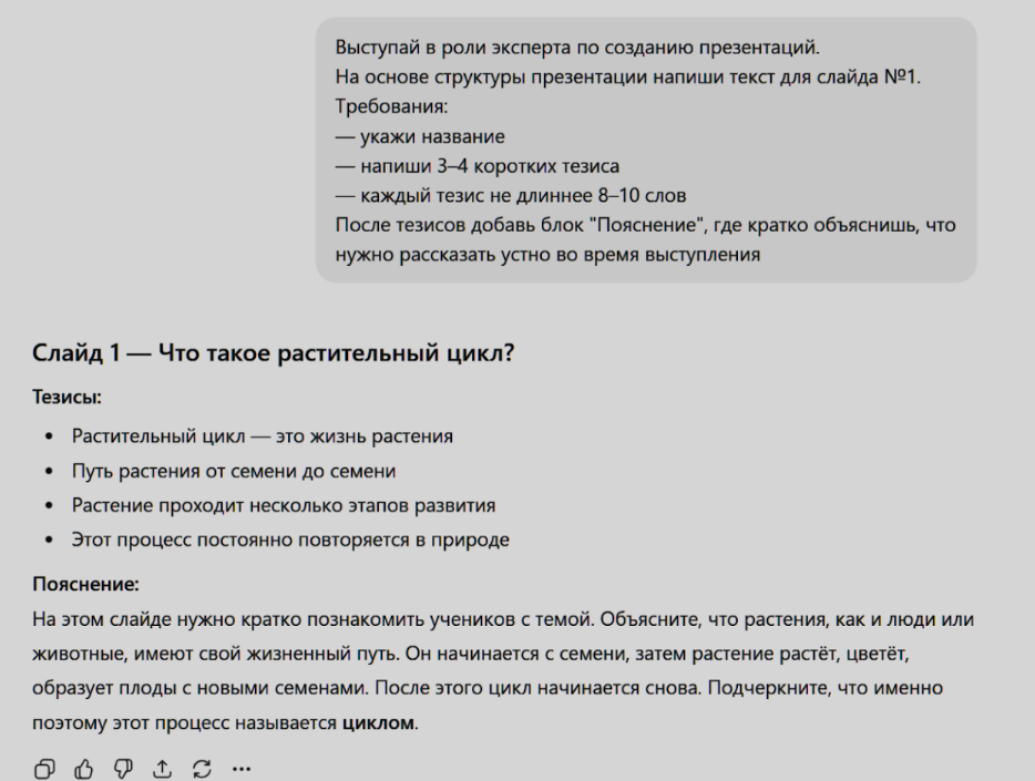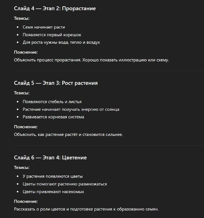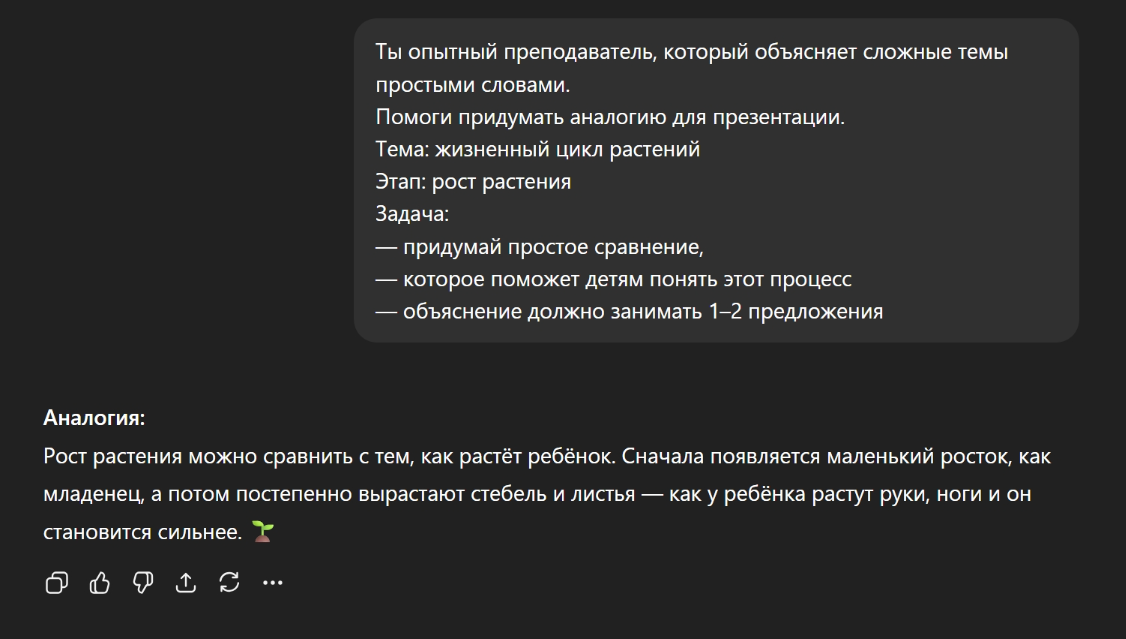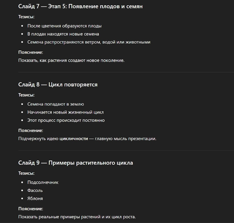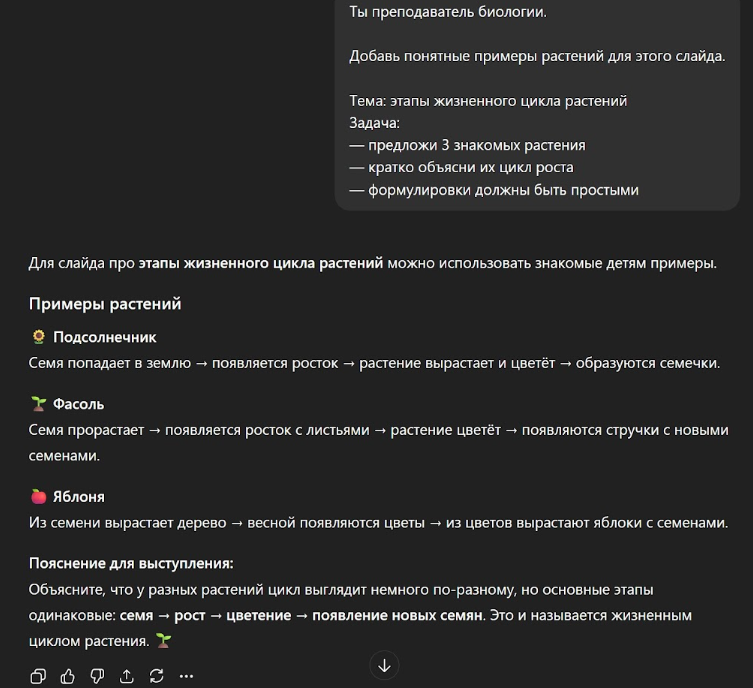 Во-вторых, задайте ChatGPT промпт придумать простой пример. В нашей презентации про растительный цикл это может быть пример знакомых растений – подсолнечника, фасоли или яблони.