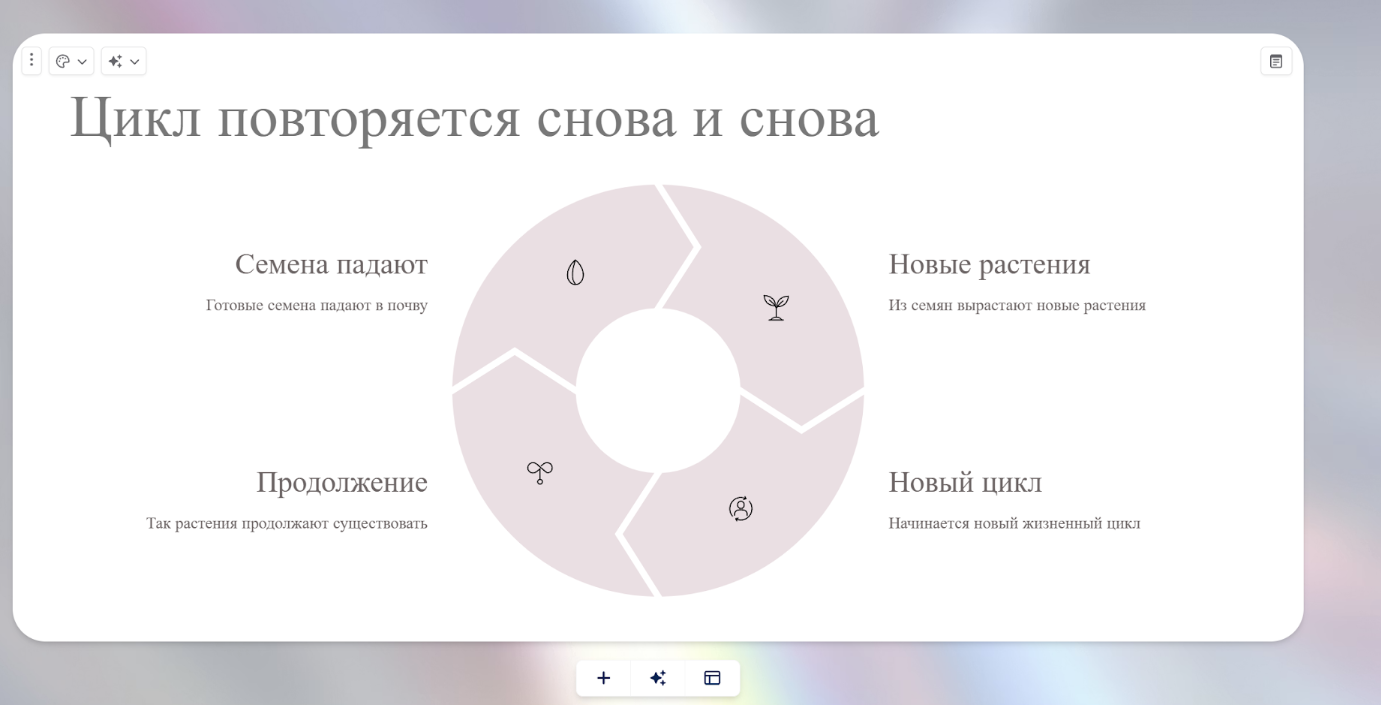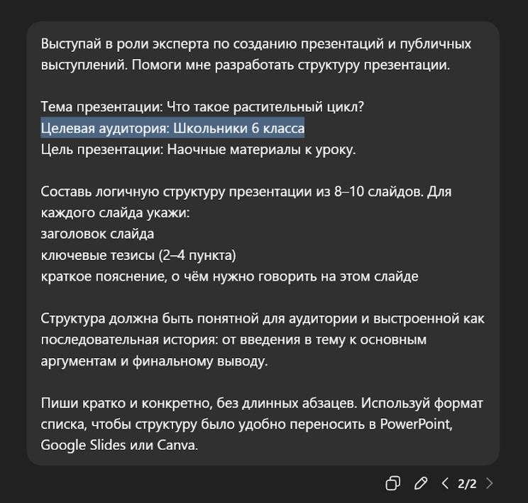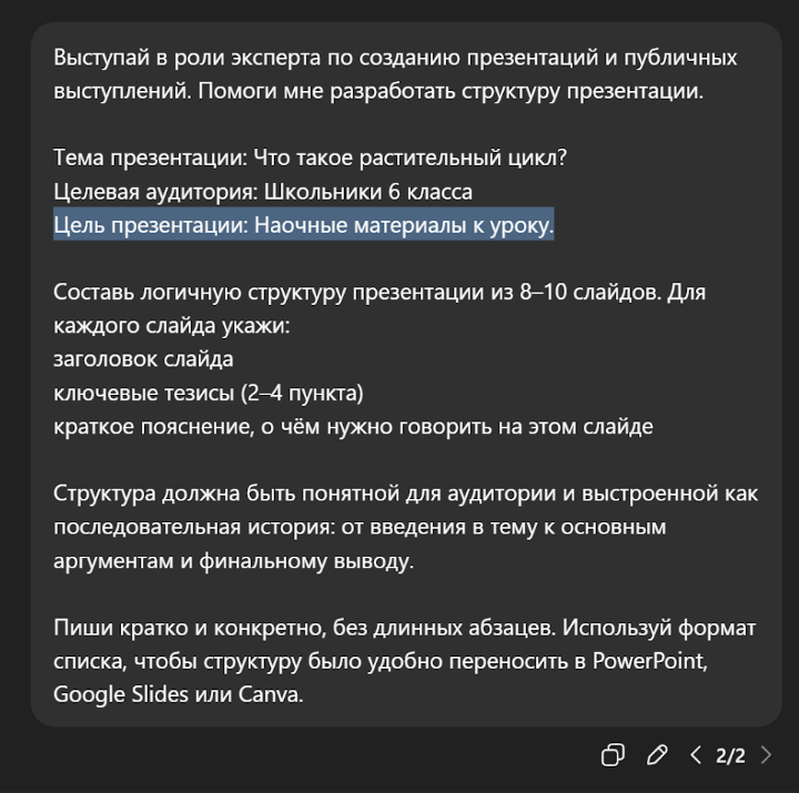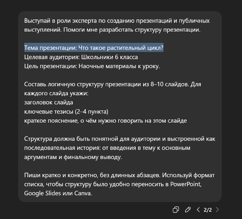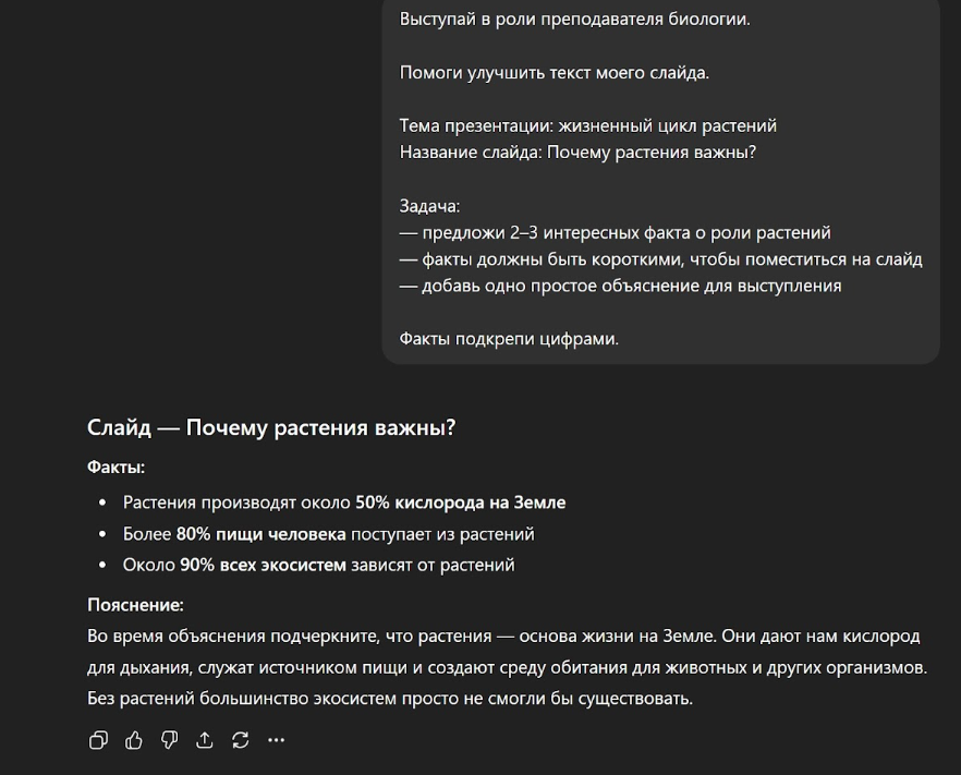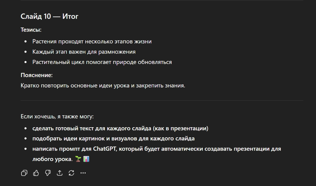 Во-вторых, задайте ChatGPT промпт придумать простой пример. В нашей презентации про растительный цикл это может быть пример знакомых растений – подсолнечника, фасоли или яблони.