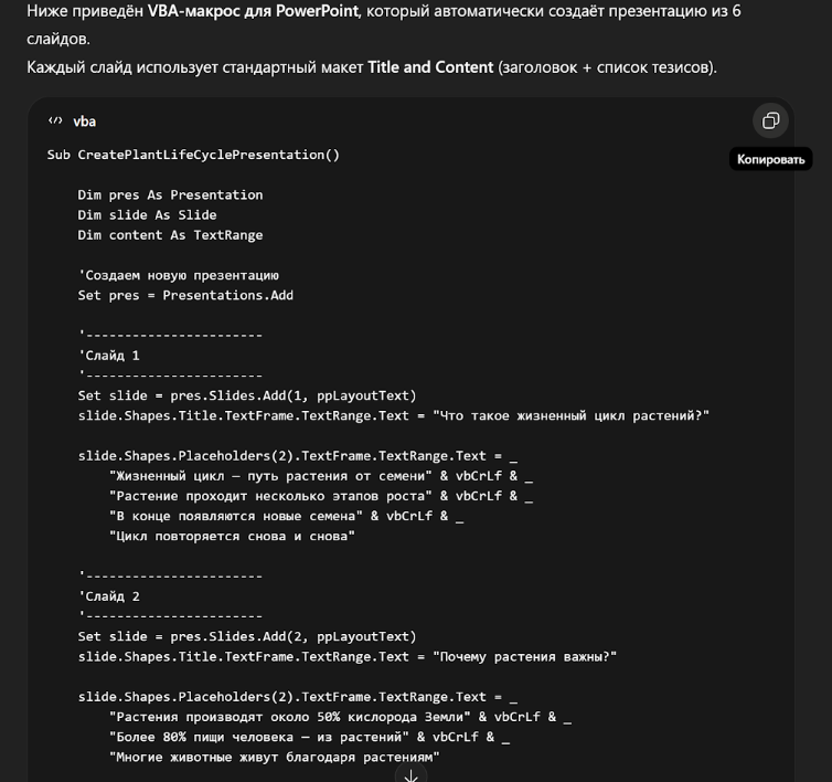 Шаг 1. Попросите ChatGPT создать VBA-макрос для PowerPoint, а затем скопируйте полученный код.