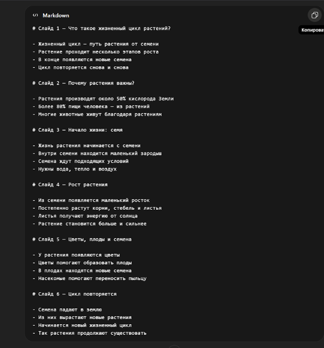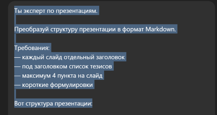 Шаг 1. Попросите ChatGPT выдать презентацию в формате Markdown и скопируйте текст.