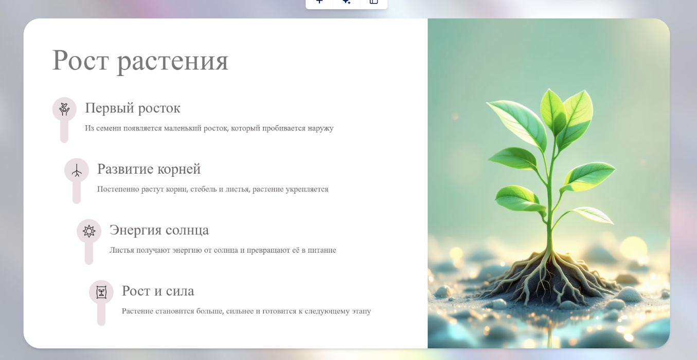 После этого материал остаётся перенести в PowerPoint, Google Slides или Canva. Именно там добавляется визуальный дизайн: шаблоны, изображения, иконки и оформление слайдов.