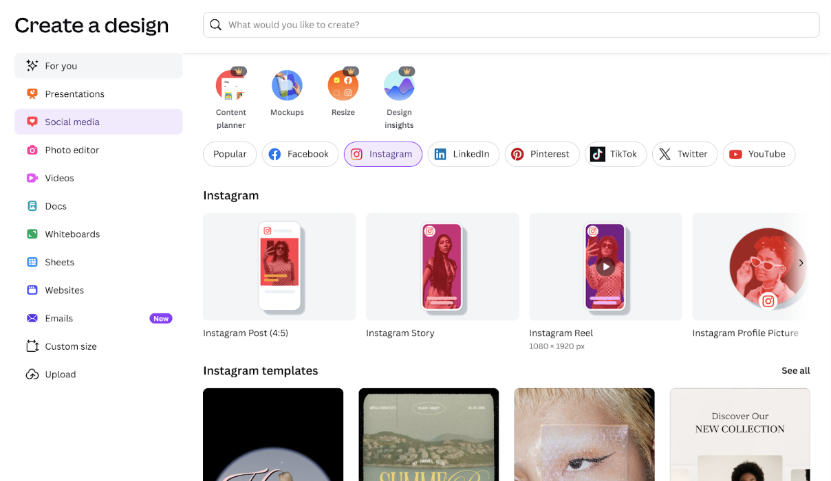 Шаг 1. Создайте новый проект. На главном экране введите в поиск «Instagram Reels» и выберите шаблон или пустой проект с нужным форматом.