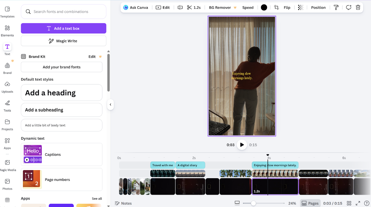 Шаг 5. Наложите текст. В левой панели выберите «Текст» → нужный стиль. Потяните текстовый блок в нужное место на холсте. Здесь же настраивается шрифт, цвет, размер и анимация появления.