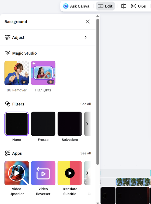 Шаг 6. Внизу под кадрами нажмите на иконку звука. Здесь есть две вкладки: ваши загруженные треки и музыкальная библиотека Canva.