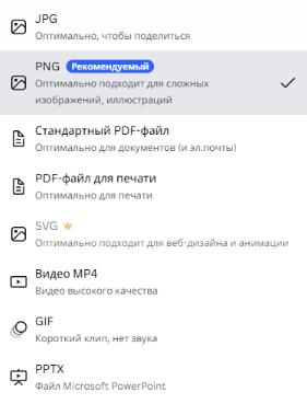 Всё зависит от того, где и как вы будете использовать дизайн. Canva даёт на выбор несколько форматов: PNG, JPG, PDF, SVG, MP4, GIF и PPTX.