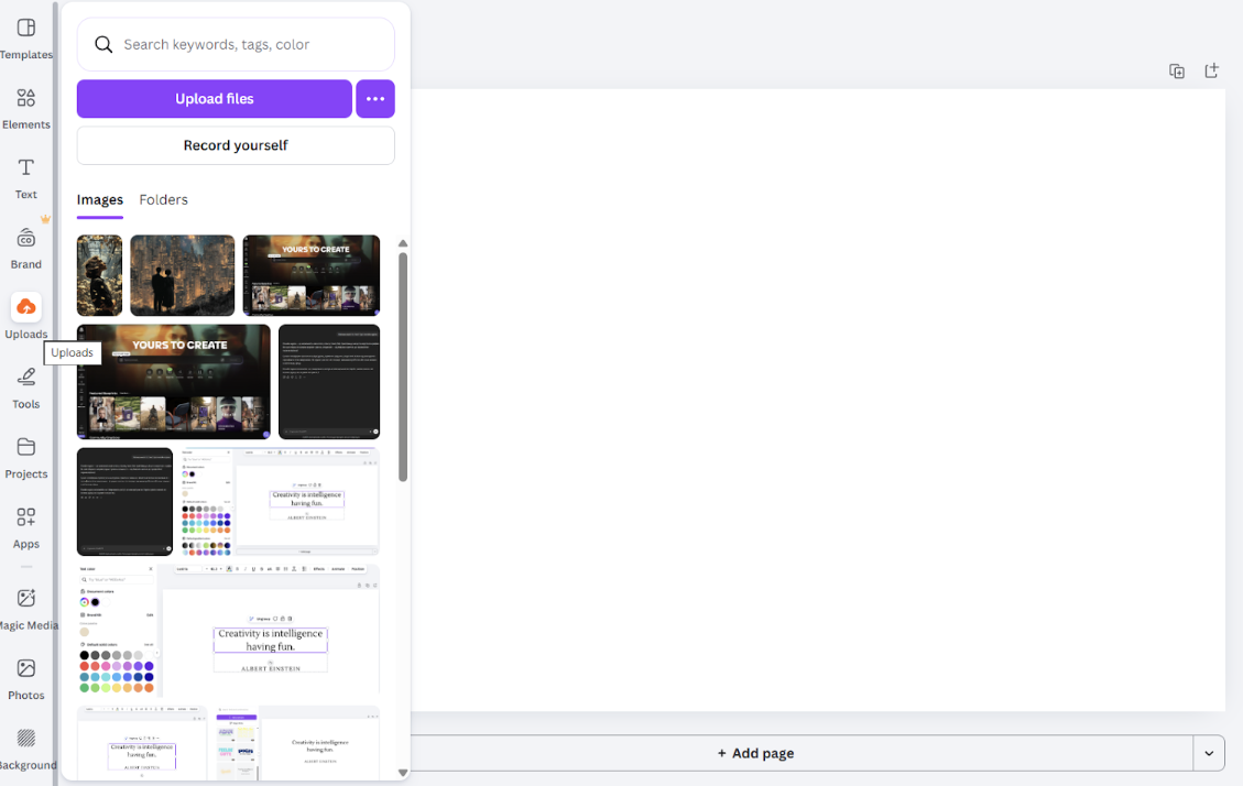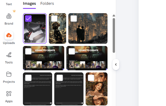 Шаг 4. Затем выберите снимок на компьютере или телефоне. Canva поддерживает форматы: JPG, PNG, HEIC и SVG. После загрузки файл появится в галерее слева.