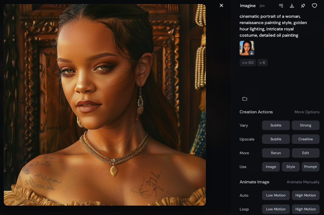 cinematic portrait of a woman, renaissance painting style, golden hour lighting, intricate royal costume, detailed oil painting --cref [ссылка на фото] --cw 0