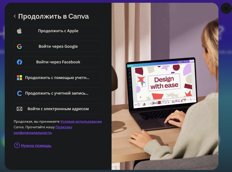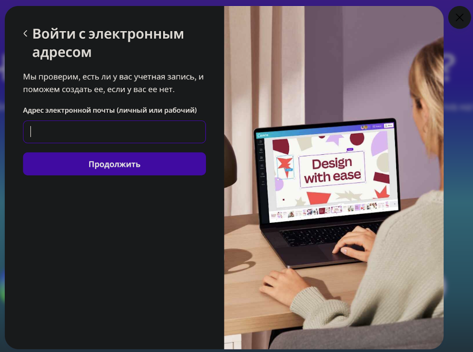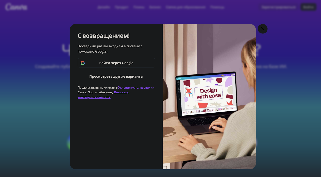 На странице входа нажмите «Continue with Google» и выберите свой аккаунт. Canva сама создаст профиль и сразу откроет главный экран.