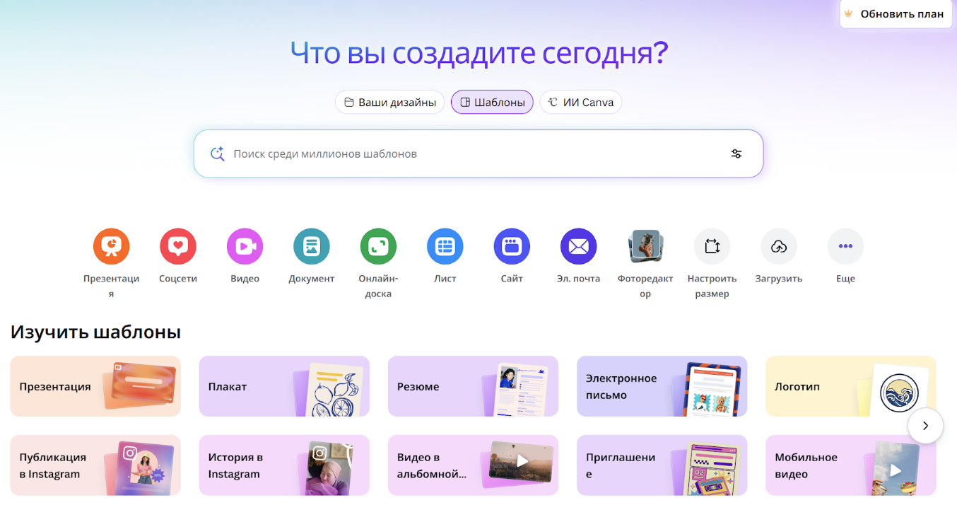 На главном экране вас ждут разные форматы: презентации, посты для соцсетей, плакаты, открытки и многое другое. Просто кликните на любой шаблон, чтобы перейти в редактор. Там вы сможете легко поменять текст, картинки и цвета на свои.