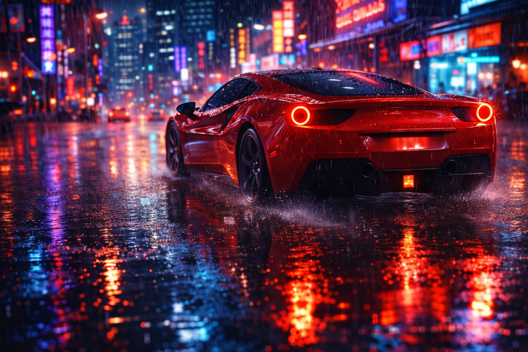 «Спортивный красный автомобиль едет по ночному мегаполису. Идет сильный дождь. Отражения неоновых вывесок на мокром асфальте. Кинематографичное освещение, гиперреализм, высокое разрешение».