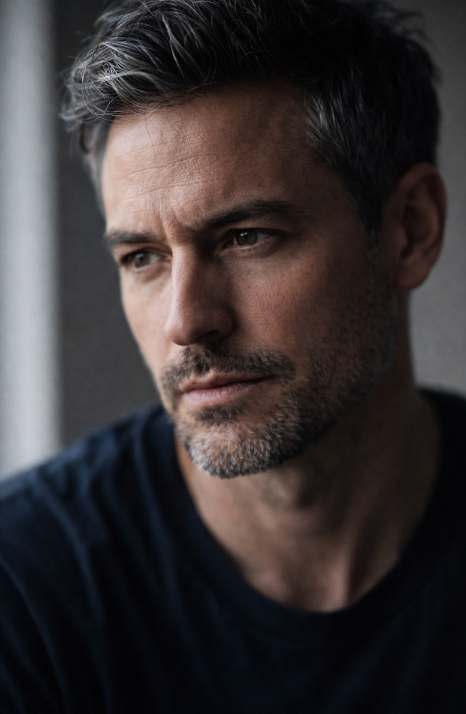 «Крупный план. [Возраст и пол, например: Мужчина 40 лет] с [особенность: легкой сединой]. Мягкий оконный свет падает сбоку. Глубокие тени на лице. Объектив 85mm, диафрагма f/1.8. Естественная текстура кожи, фотореализм».
