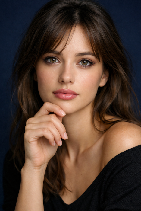 «Студийный портрет на [цвет: темно-синем] фоне. [Кто: Девушка] смотрит прямо в камеру. Легкая эмоция: [улыбка / задумчивость]. Заполняющий свет от софтбокса. Журнальный стиль, высокая детализация глаз».