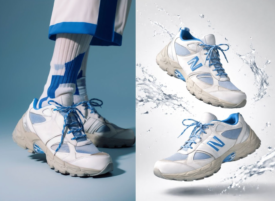 «Минималистичная динамичная композиция. [Товар: Кроссовки] левитируют в воздухе. Вокруг разлетаются [детали: мелкие брызги воды]. Нейтральный [цвет: светло-серый] фон. Резкий фокус на логотипе, коммерческая фотография».