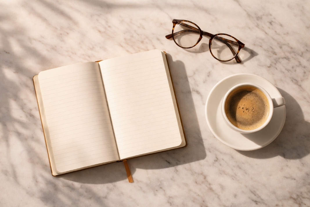 «Раскладка flat-lay сверху на [поверхность: белом мраморном столе]. В кадре аккуратно лежат: [предмет 1: открытый блокнот], [предмет 2: очки] и чашка кофе. Утренний солнечный свет, мягкие длинные тени. Теплые тона, эстетика минимализма».