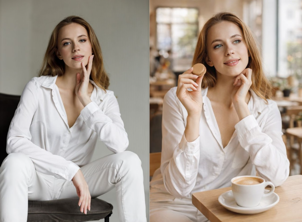 Фото 1 – это референс модели и композиции. Полностью измени лицо и черты внешности модели. Сгенерируй нового, уникального человека.