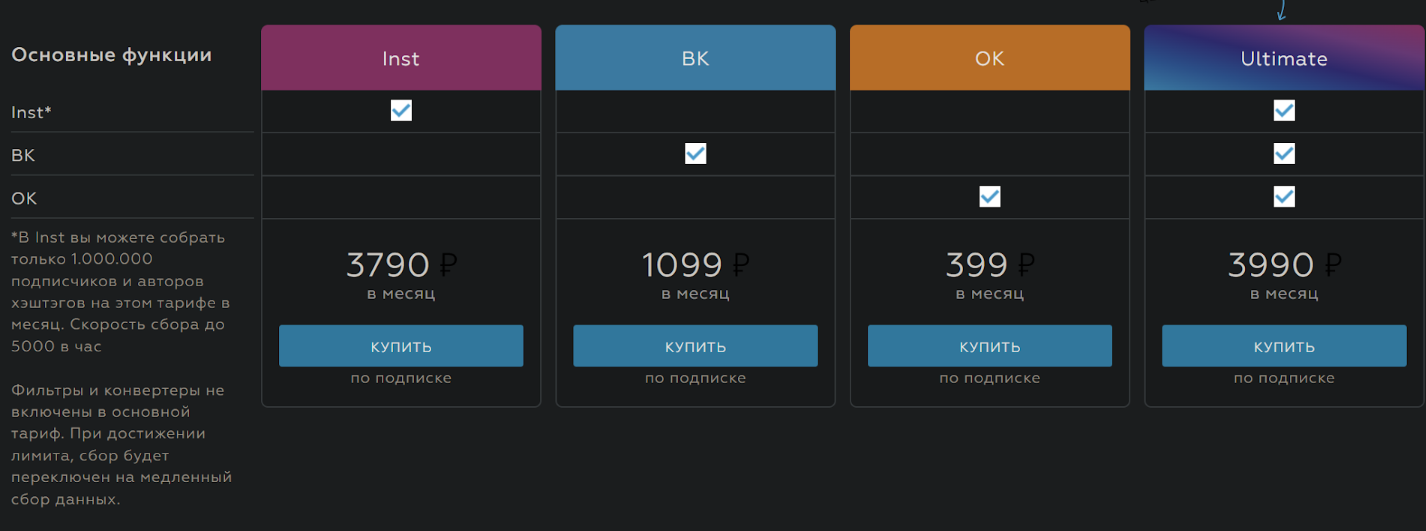 При клике на нужную соцсеть открывается список парсеров: подписчики, авторы хештегов, лайкеры и комментаторы, фильтры аудитории, пересечение аудиторий и другие. Обратите внимание: в зависимости от соцсети, они будут немного меняться, но 90% времени вы будете использовать: