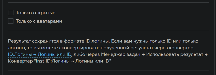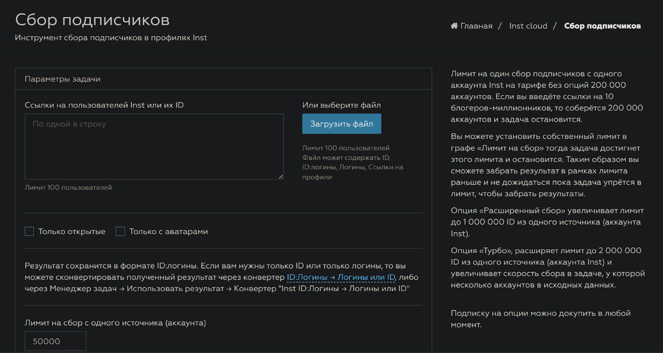 В поле «Лимит на сбор» по умолчанию установлено значение 50 000. Это значит, что при парсинге крупного блогера система соберет первые 50 тысяч подписчиков и остановится. Для получения полной базы увеличьте это число или снимите ограничение.