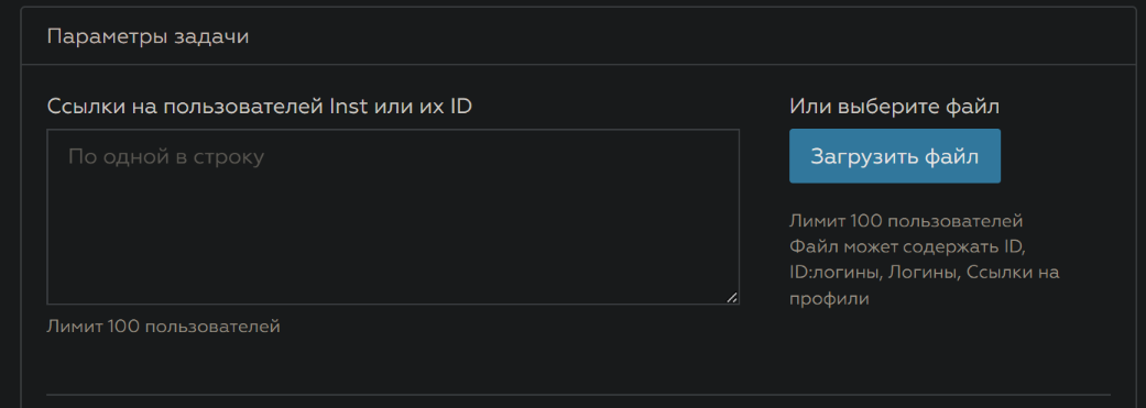 Важно! Ссылки указываются строго по одной в строку. За один раз система обрабатывает до 100 доноров. Если список больше, разделите его на несколько задач.