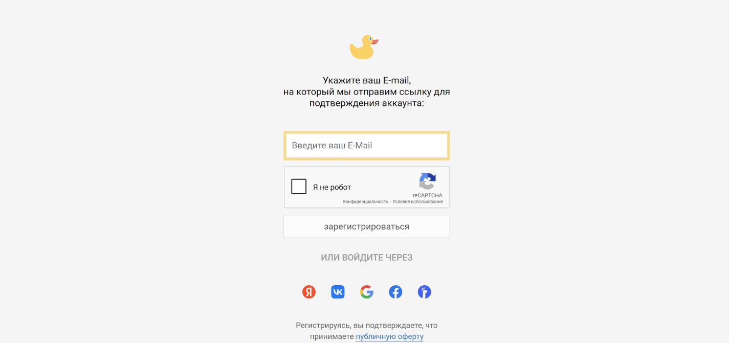 Шаг 2. Укажите адрес электронной почты, или войдите с помощью аккаунта Google, Facebook, либо Вконтакте.