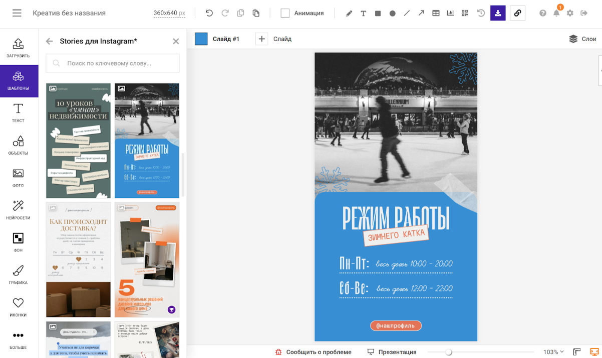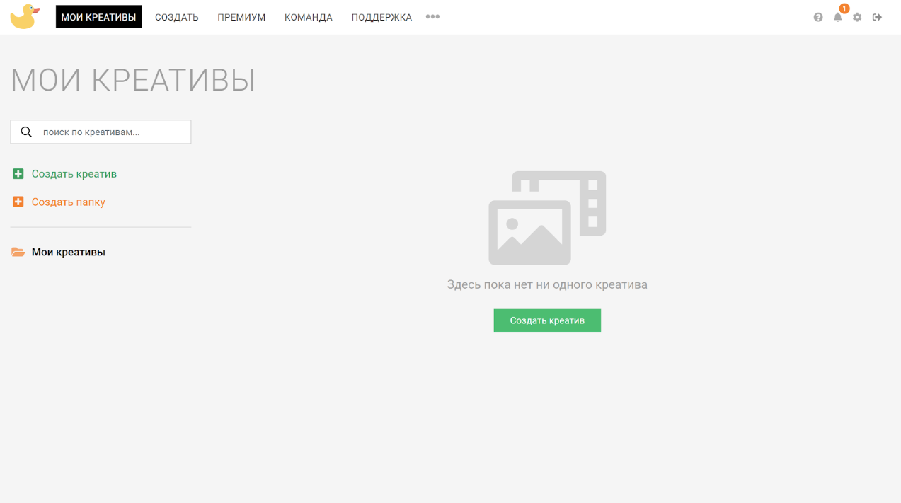 Шаг 3. Готово. Вы попали в аккаунт. Заполнять личный профиль не нужно, можно сразу выбирать шаблон и создавать креатив.