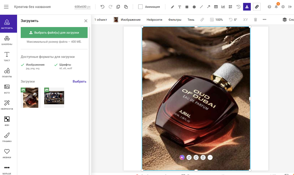 Шаг 1. Загрузите изображение в редактор. Это можно сделать через кнопку загрузки или перетащив файл прямо на холст.