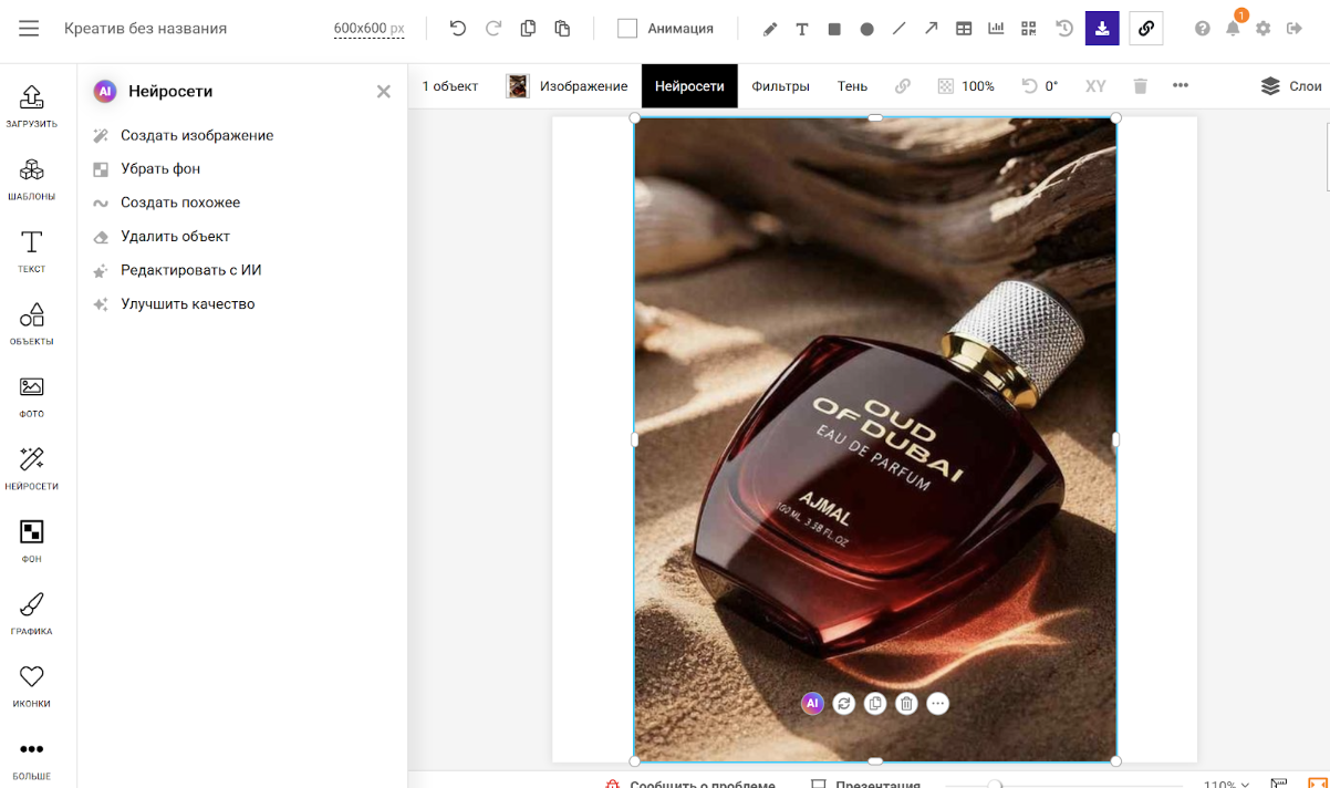 Шаг 2. Выделите изображение. После этого в панели инструментов появятся доступные действия для работы с картинкой. Выберите «Нейросети» → «Убрать фон».