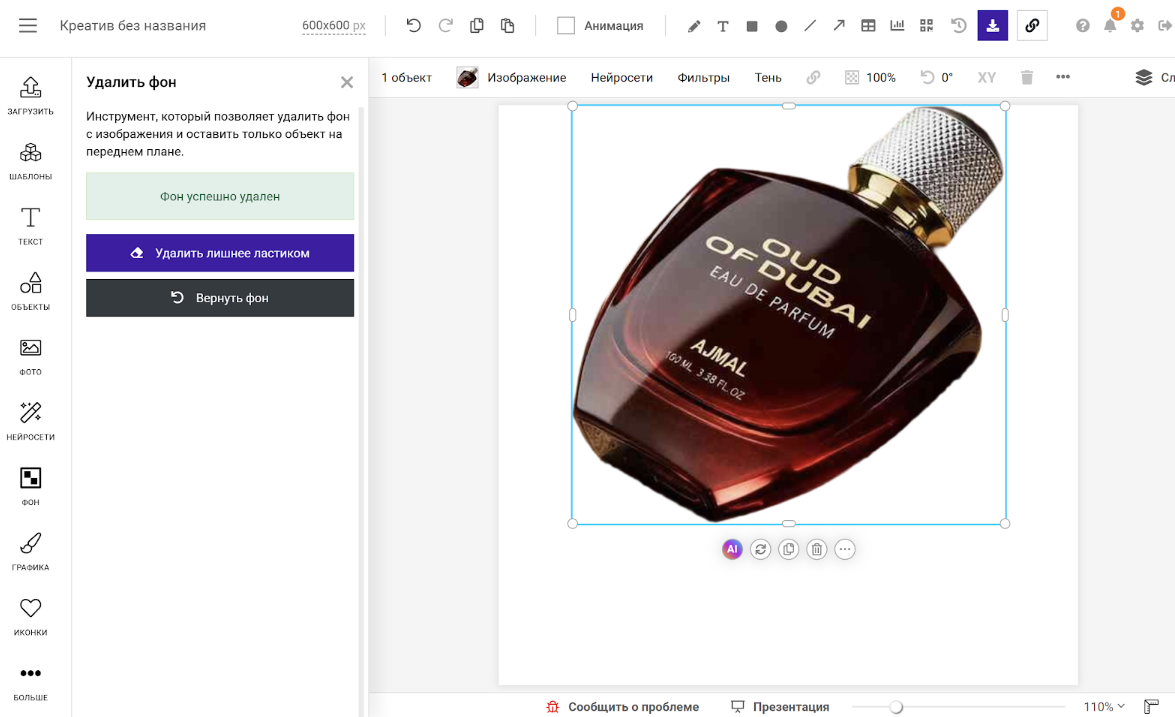 Иногда ИИ может «съесть» кусок сложного контура или оставить тень. В таком случае рядом с кнопкой удаления фона есть инструмент «Ластик», которым можно вручную подправить мелкие детали.